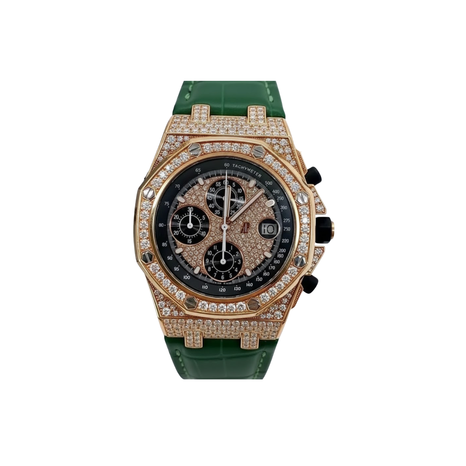 Powered by a high-performance automatic chronograph movement, this timepiece delivers both precision and prestige, seamlessly blending technical mastery with extravagant design. The green alligator leather strap adds contrast and sophistication, ensuring comfort while maintaining its striking aesthetic.