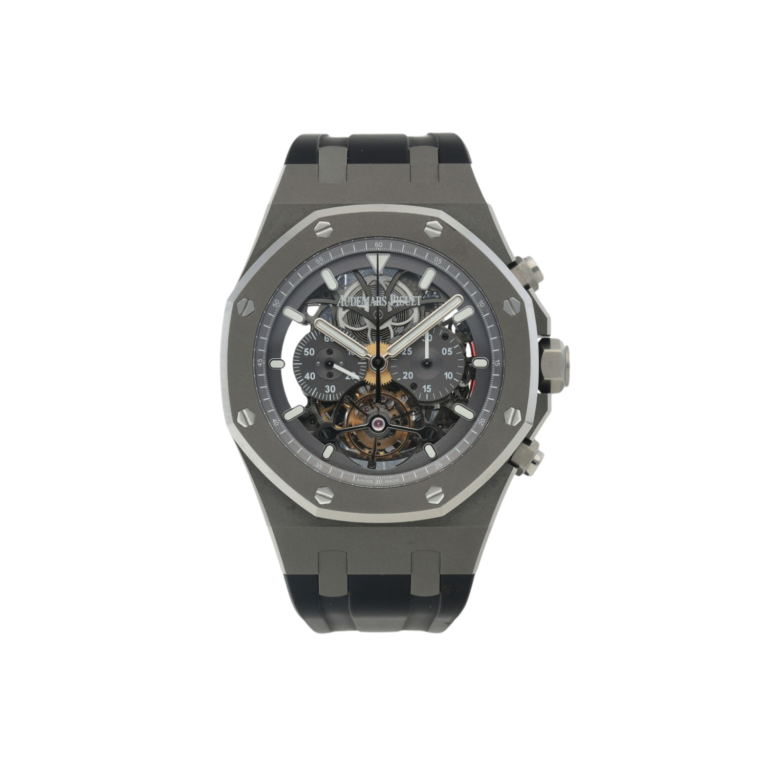 The Audemars Piguet Royal Oak Tourbillon Ref. 26347TI.GG.D004CA.01 is a striking expression of technical mastery and modern sports-luxury design. Crafted in lightweight grey titanium, the 44mm octagonal case is secured by the Royal Oak’s signature eight hexagonal screws and paired with a matching grey rubber strap, ensuring both durability and comfort. The slate grey skeletonized dial offers a captivating view of the hand-wound Calibre 2936, while rose gold-tone hands and applied hour markers provide contrast and legibility, enhanced by luminescent detailing. The chronograph layout features three sub-dials displaying 60 seconds, 30 minutes, and the tourbillon, seamlessly integrating high complication with visual balance. Beating at 21,600 vibrations per hour and offering an impressive 72-hour power reserve, the movement is composed of 299 meticulously finished components and visible through the sapphire exhibition caseback. With scratch-resistant sapphire crystal, screw-down crown, and water resistance to 200 meters, this Royal Oak Tourbillon Chronograph stands as a powerful fusion of avant-garde engineering, robust performance, and unmistakable Audemars Piguet design.