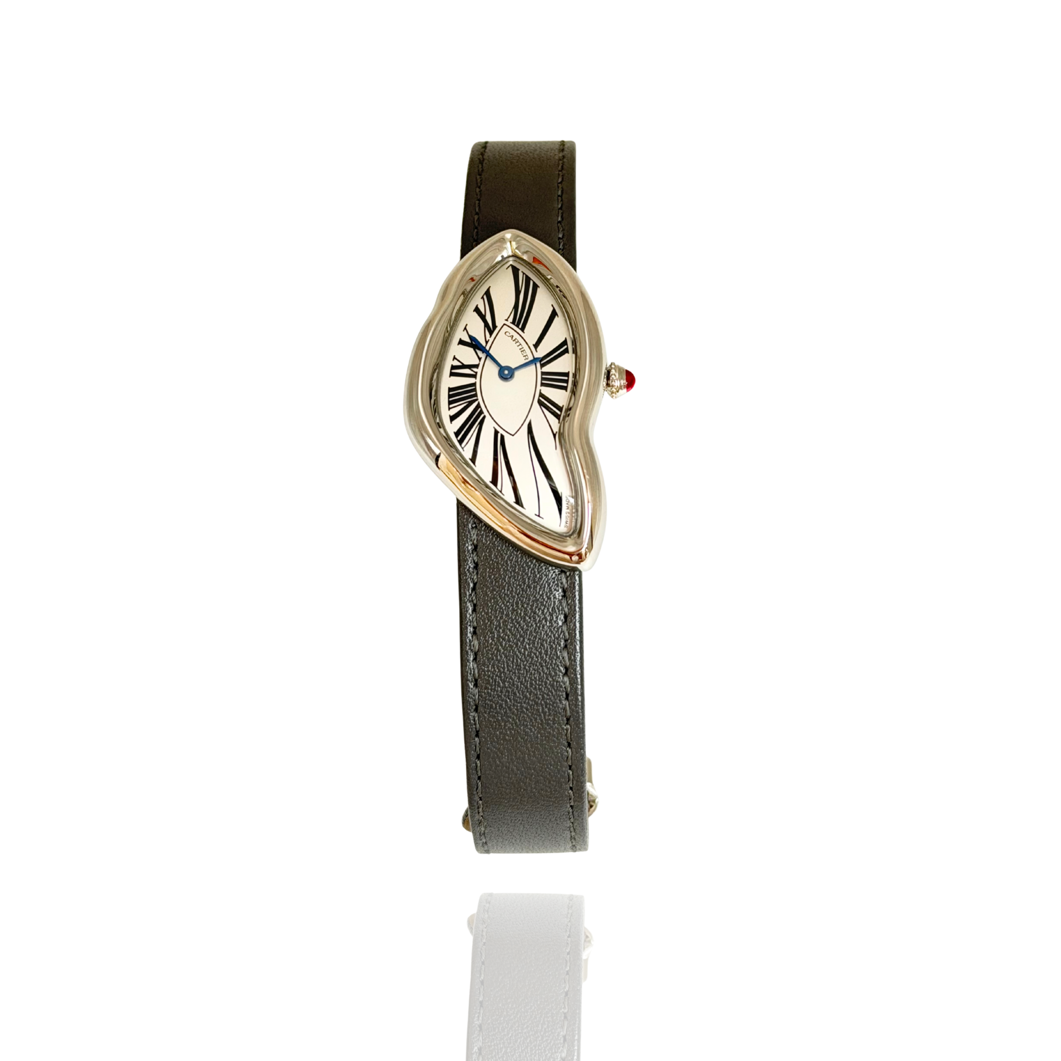 Paired with a grey calfskin strap that contrasts elegantly with the cool-toned metal, the watch maintains a harmonious, modern sophistication. The dial remains true to the original icon: stretched Roman numerals, blued-steel hands, and unmistakable Cartier artistry.