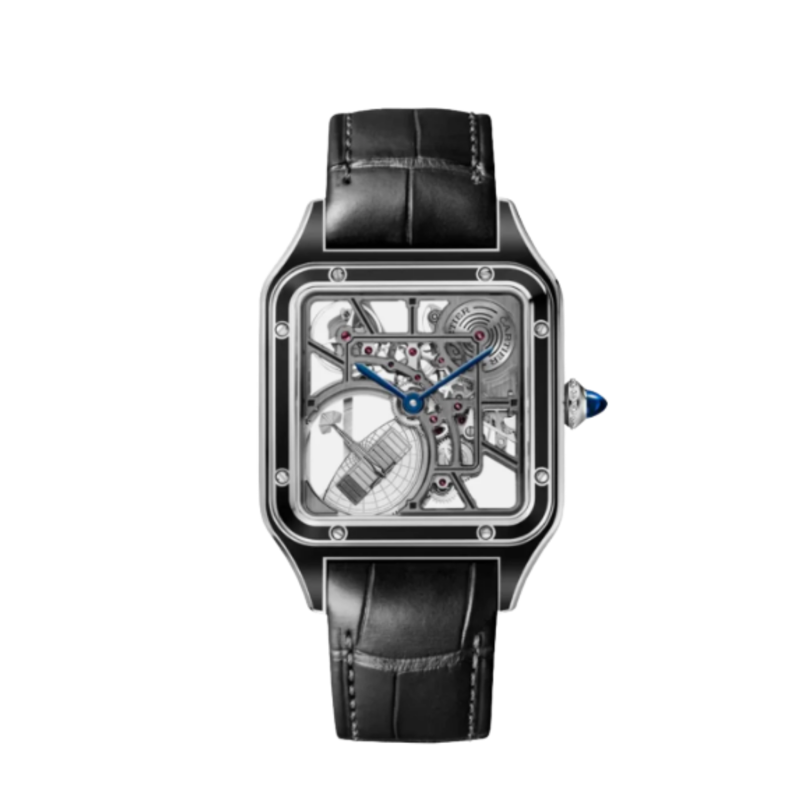 This large model features a steel case enhanced with black lacquer, creating a striking contrast against the openworked architecture of the dial. The bridges, also coated in black lacquer, form the structured Roman numeral motif, an iconic Cartier design element seamlessly integrated into the skeletonized movement. Blued-steel sword-shaped hands add a refined touch, while sapphire crystal and a transparent caseback reveal the intricate mechanics within.