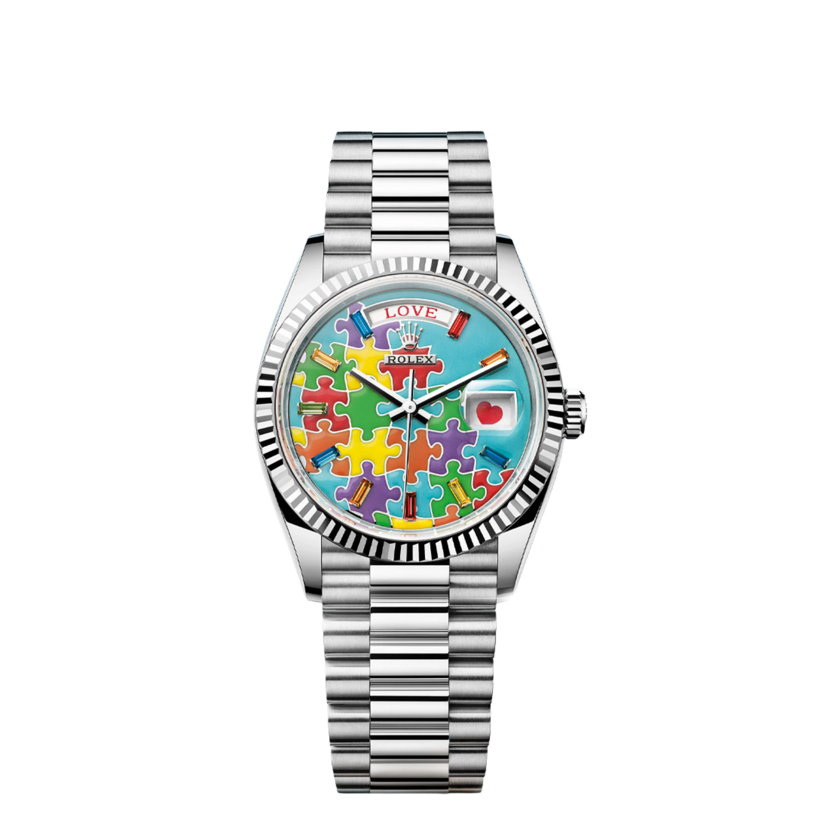 The Rolex Day-Date 36 Ref. 128238 offers a playful and unconventional take on the legendary President line. Crafted entirely from 18k white gold, its 36 mm case and fluted bezel surround a vibrant champlevé enamel dial rendered in a multicolored jigsaw puzzle motif. In place of the traditional calendar display, the day wheel presents seven positive affirmations—among them “Love” and “Hope”—while the date aperture cycles through 31 expressive emojis, turning each glance into a delight.
