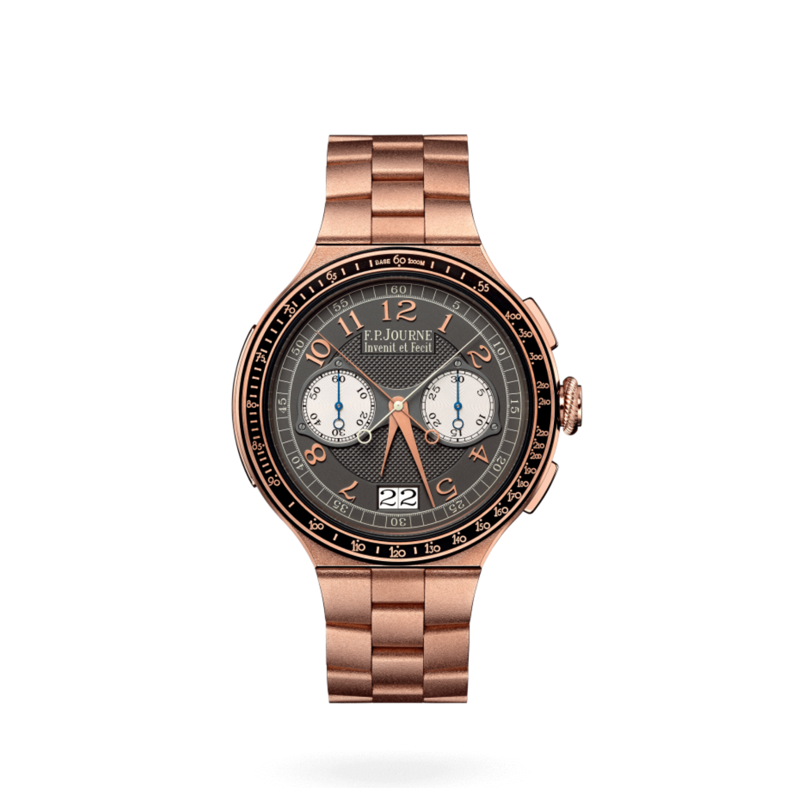 The F.P. Journe Chronographe Rattrapante is a masterful expression of haute horlogerie, combining technical sophistication with elegant design. Crafted in 18K rose gold, the 44 mm case with a 12 mm thickness houses F.P. Journe’s monopoussoir split-seconds chronograph movement, now enhanced with a very large date display. The dial is thoughtfully designed for legibility, with the 5.20 mm × 2.80 mm date window offering clear visibility without disrupting the refined aesthetic.