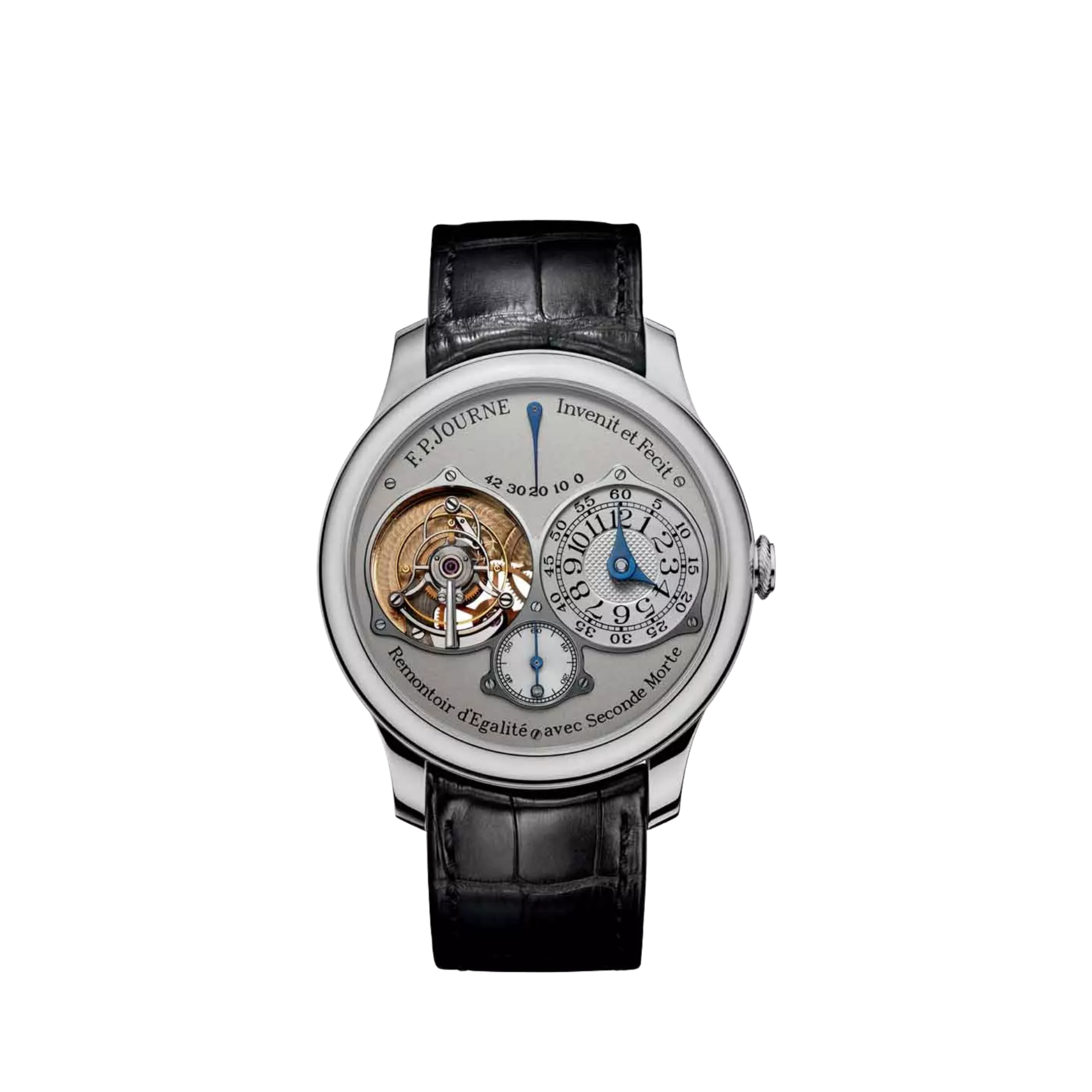 The F.P. Journe Tourbillon Souverain Référence TN in platinum is a landmark achievement in contemporary haute horlogerie, embodying François-Paul Journe’s uncompromising pursuit of chronometric precision. Housed in a prestigious platinum case, the watch is powered by the in-house Calibre 1403, which integrates a tourbillon with a patented constant-force mechanism (remontoir d’égalité) to ensure consistent energy delivery and exceptional timekeeping stability. A rare dead-beat seconds complication further underscores the movement’s scientific approach to precision, allowing the seconds hand to advance in exact one-second intervals. Crafted in accordance with F.P. Journe’s exacting standards, the movement is executed in solid 18k gold and finished to the highest level of traditional watchmaking artistry. Combining technical innovation, noble materials, and intellectual depth, the platinum Tourbillon Souverain Réf. TN stands as one of the most revered and important creations in modern independent watchmaking.
