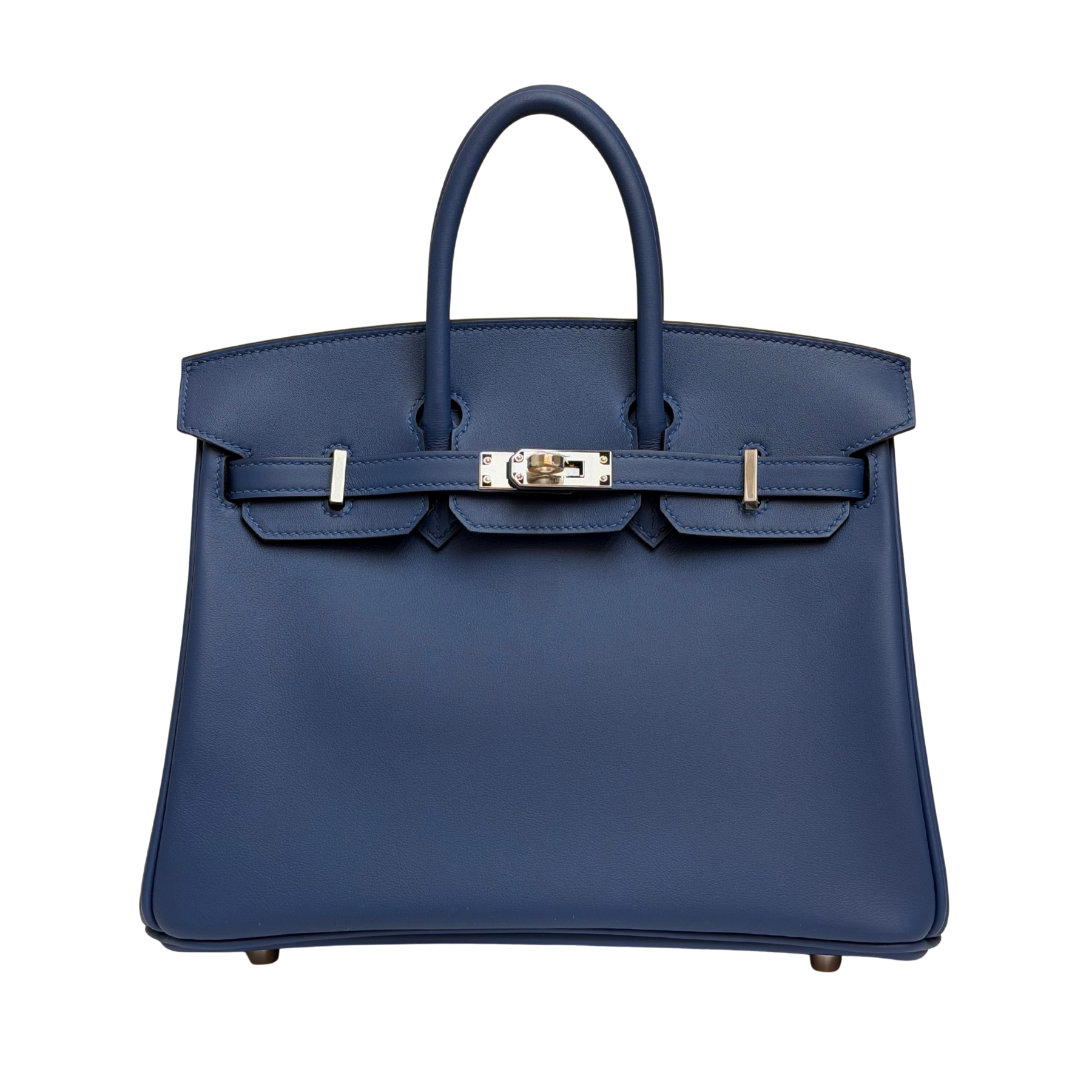 This Hermès Birkin 25 is crafted from ultra-smooth Swift leather in the exquisite Bleu Tie shade — a fresh, modern take on classic elegance. Known for its soft, buttery texture and delicate sheen, Swift leather brings a sophisticated fluidity to the iconic Birkin silhouette.