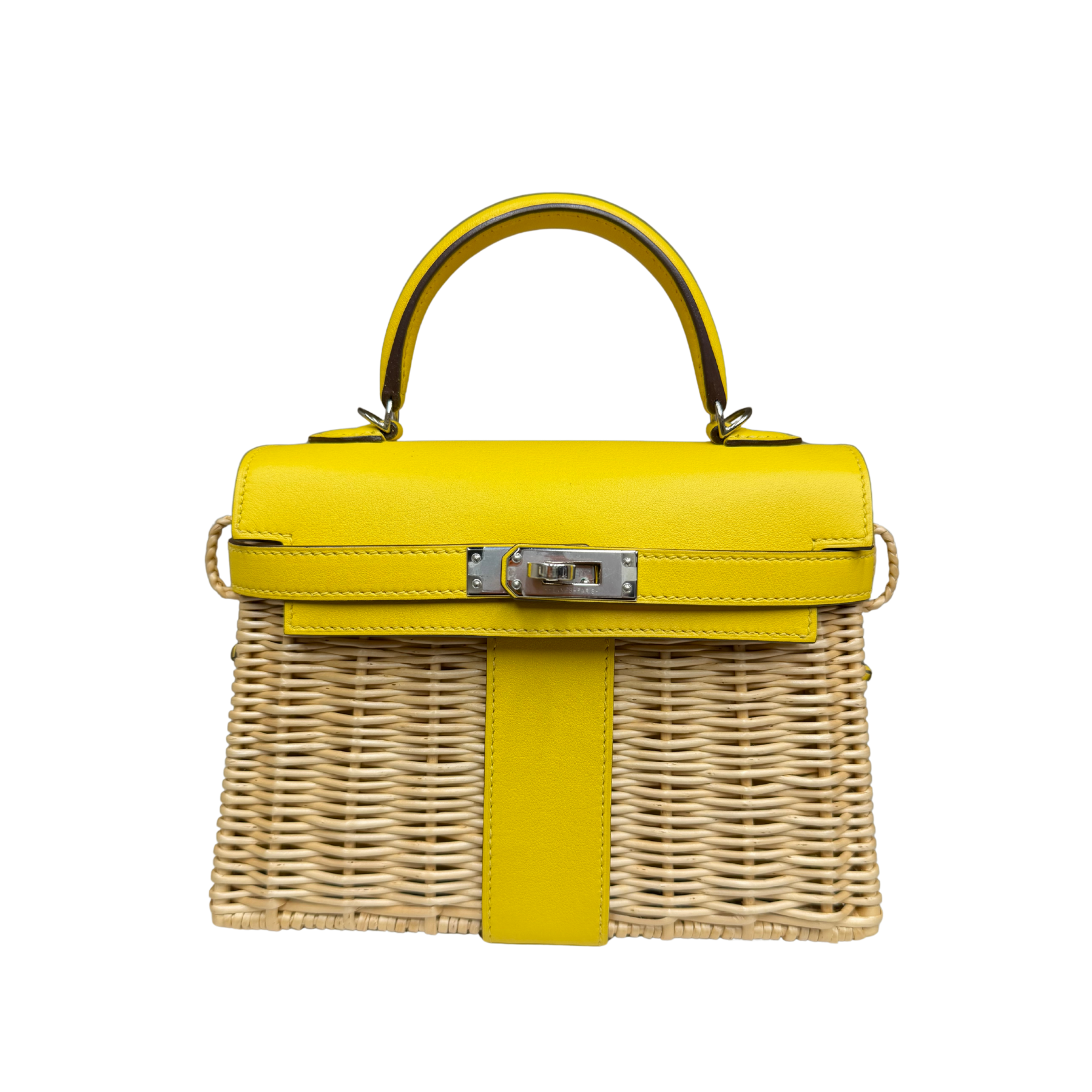 Introducing the Hermès Mini Kelly 20 “Picnic” in Jaune de Naples Swift leather and Osier wicker with palladium hardware—a playful yet elegant take on the iconic Kelly silhouette … view full details