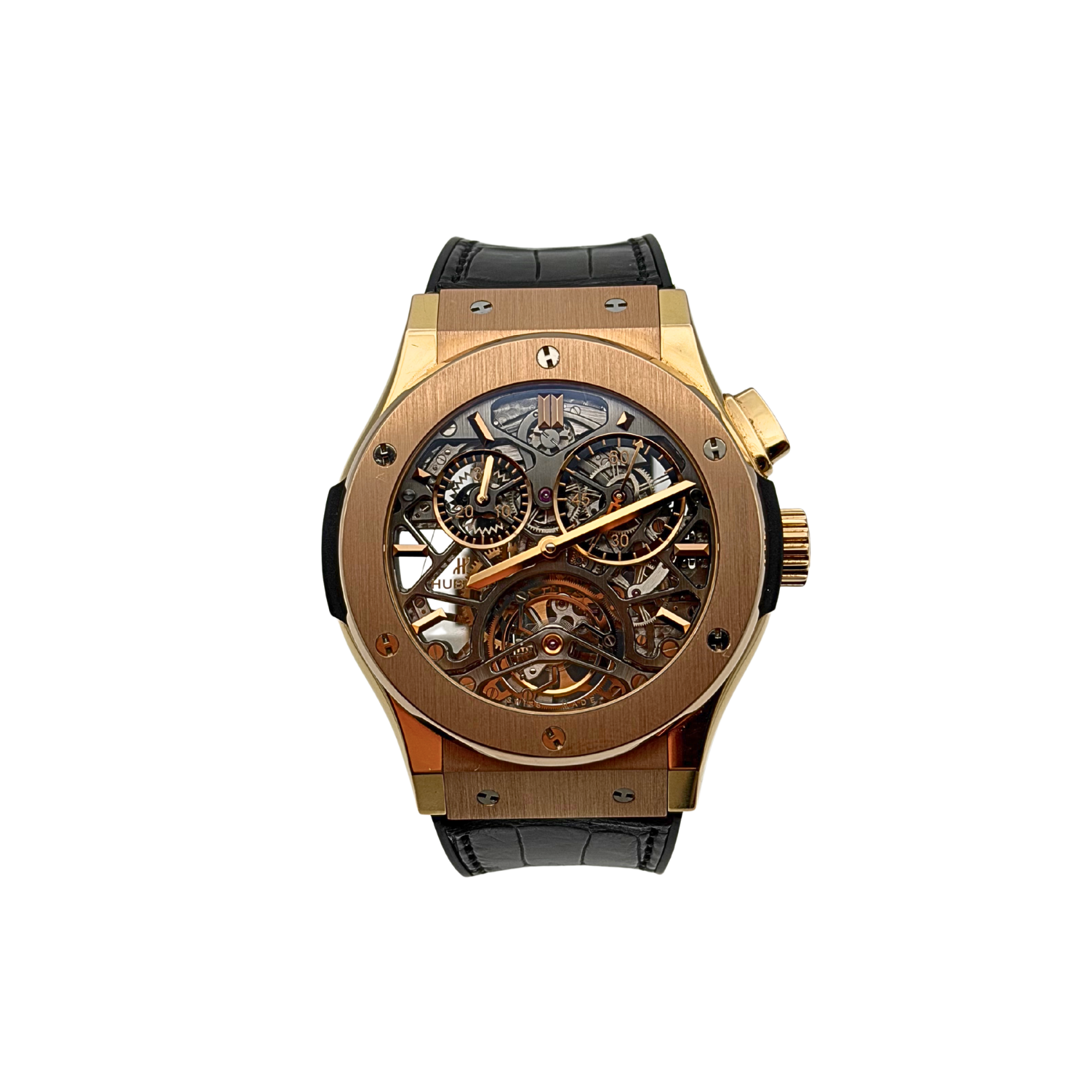 The Hublot Classic Fusion Tourbillon Skeleton King Gold 45 mm (Reference 506.OX.0180.LR) is a limited-edition luxury timepiece, restricted to 99 pieces worldwide, which features an 18K King Gold case and a manually wound skeletonized tourbillon chronograph movement … view full details