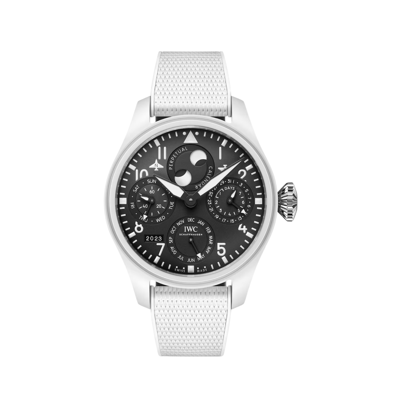 The watch features a substantial 46.5mm case made from white zirconium oxide ceramic. IWC has been a pioneer in ceramic watch cases since the 1980s, and this material is renowned for being incredibly scratch-resistant, remarkably light, and durable. The pristine white case provides a sharp contrast to the matte black dial, which features large Arabic numerals and hands coated with white Super-LumiNova® for exceptional legibility in all lighting conditions. The aesthetic is completed by a white textured rubber strap with a ceramic folding clasp, a stainless steel case back ring, and a screw-in crown.