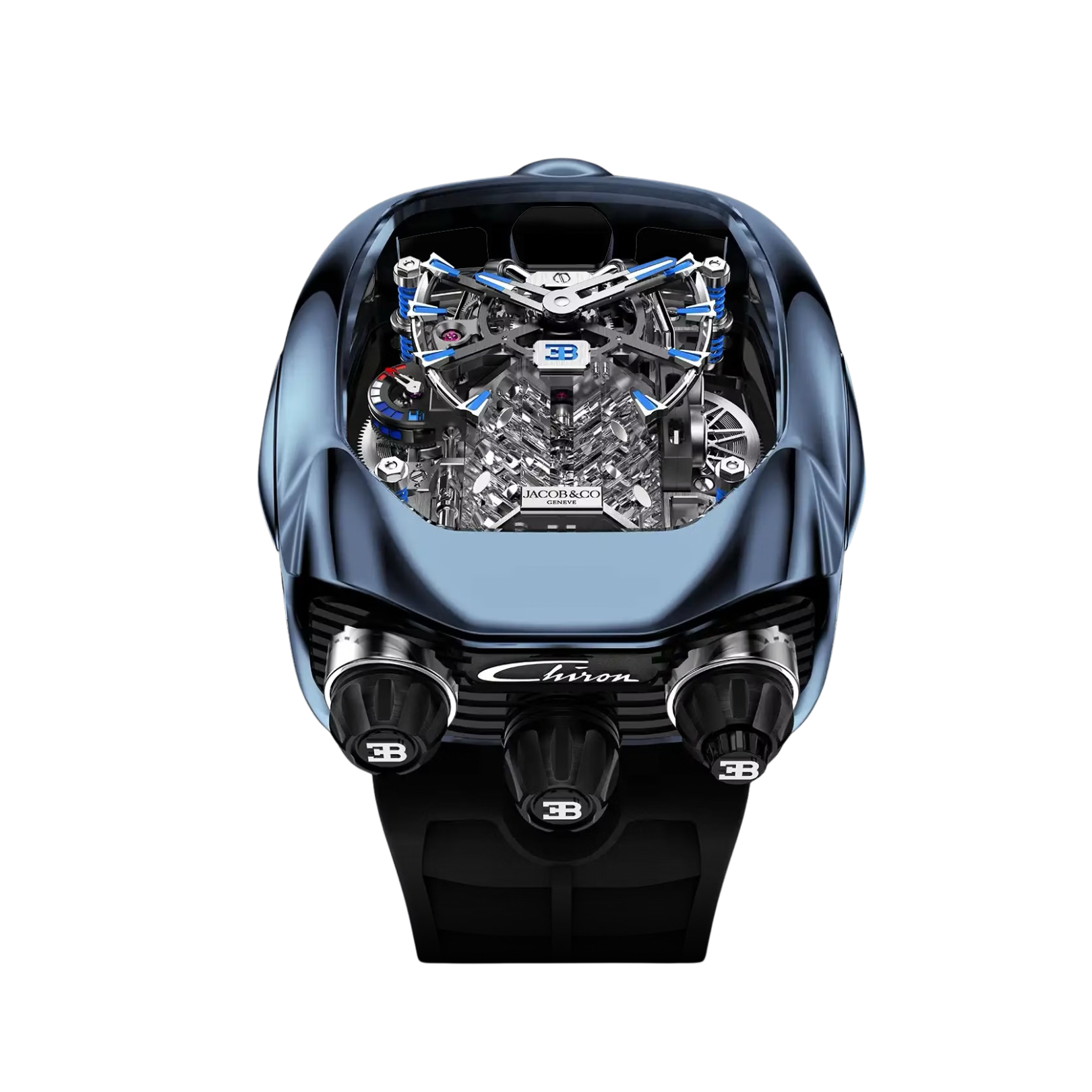 The Jacob & Co. Bugatti Chiron Tourbillon represents the ultimate fusion of haute horlogerie and hypercar engineering, translating Bugatti’s legendary performance into an extraordinary mechanical timepiece. At its heart lies a dramatic, engine-inspired tourbillon movement that evokes the power and complexity of the Chiron’s iconic W16 engine, complete with a miniature automaton that brings the watch to life at the push of a button. Encased in sapphire crystal, the architecture of the movement is fully exposed, offering an unobstructed view of its intricate mechanics from every angle. Designed with both spectacle and precision in mind, the watch delivers exceptional performance, supported by a robust power reserve and meticulous finishing throughout. Bold, innovative, and unmistakably avant-garde, the Bugatti Chiron Tourbillon is a statement piece for collectors who seek the very pinnacle of technical ingenuity, exclusivity, and modern luxury.