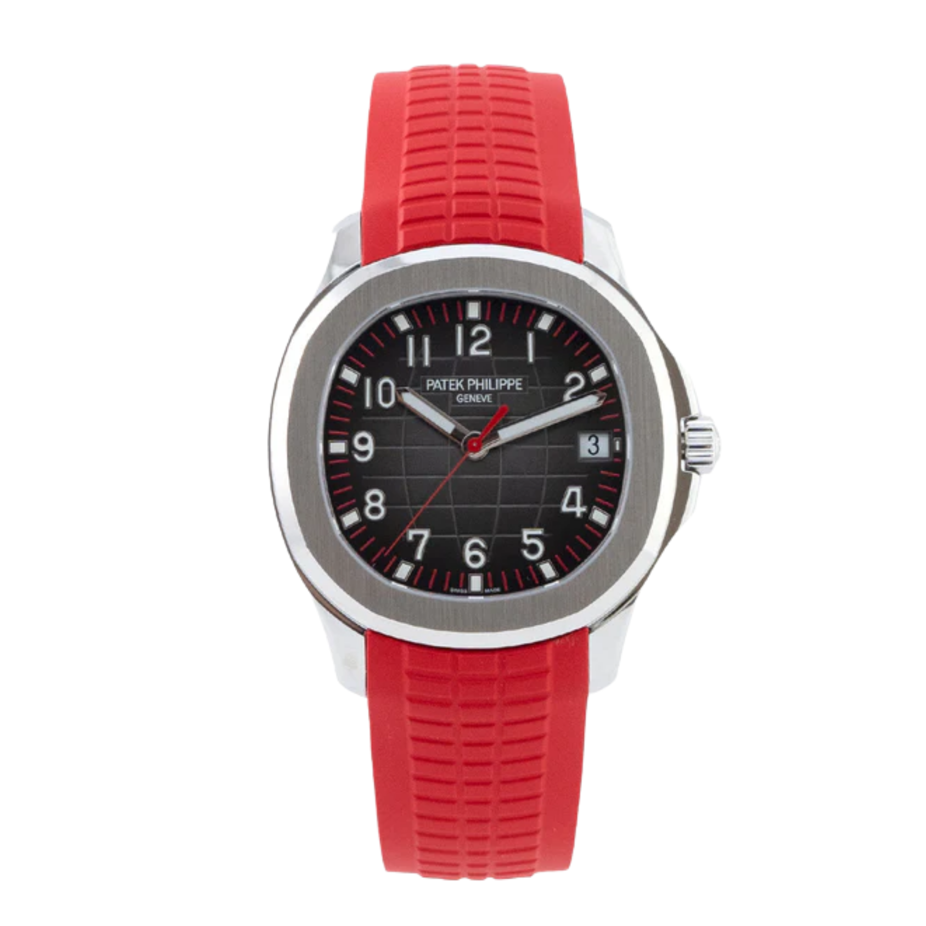 Created specifically for the 2019 Watch Art Grand Exhibition in Singapore, the watch transforms the standard 40mm stainless steel Aquanaut by integrating the bold red of the Singaporean flag throughout its design. The matte black embossed dial features a vibrant red minute track and a matching lacquered central seconds hand, creating a sense of urgency and modernity that is further amplified by its signature red “Tropical” composite strap. This pop of colour shifts the timepiece from a discreet luxury sports watch into a genuine statement piece and a highly sought-after collector’s trophy. Beyond the visible dial changes, the sapphire case back acts as a permanent souvenir of the event, bearing the commemorative “Patek Philippe Singapore 2019” inscription that shields the impeccably finished Caliber 324 S C movement within.