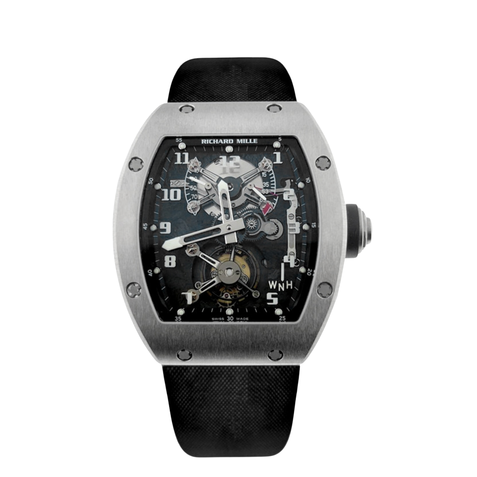 The Richard Mille RM 002 in 18k white gold is a pioneering model that shaped the brand’s technical identity. Its curved tonneau case features a brushed and polished finish, secured by signature spline screws and paired with an exhibition caseback. The open-worked dial displays luminous Arabic numerals, a tourbillon at 6 o’clock, and power reserve, torque, and function indicators. Powered by a hand-wound tourbillon movement with a carbon nanofiber baseplate, it is fitted with a black leather strap and white gold folding clasp—an iconic and highly collectible early Richard Mille.