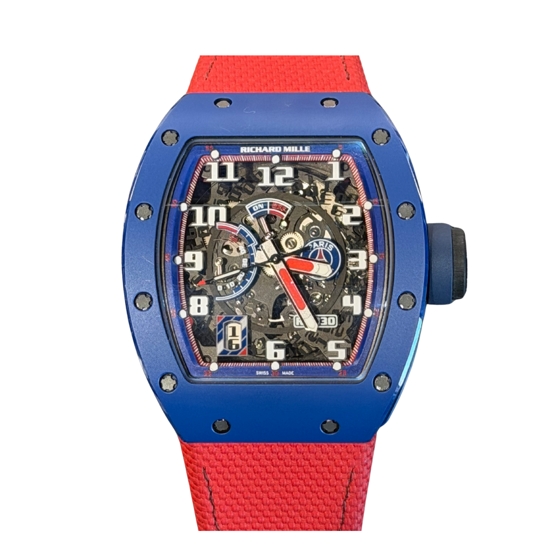 Crafted in an imposing 50mm blue ceramic case, the RM 030 Blue Ceramic “PSG Edition” makes an immediate visual statement while offering exceptional scratch resistance and durability. A red Carbon NTPT case band adds a dramatic contrast, reinforcing the watch’s technical, motorsport-inspired identity. The skeletonized dial reveals the complexity of the automatic movement beneath, balancing mechanical depth with legibility. A date indicator is positioned at 7 o’clock, while the Paris Saint-Germain badge at 3 o’clock pays tribute to the iconic football club and underscores the exclusivity of this collaboration. Fitted on a blue rubber strap for comfort and sport-ready wearability, the RM 030 is limited to just 100 pieces worldwide. This unworn example is offered complete with its original box and papers, making it a highly collectible and investment-worthy addition for discerning Richard Mille enthusiasts.