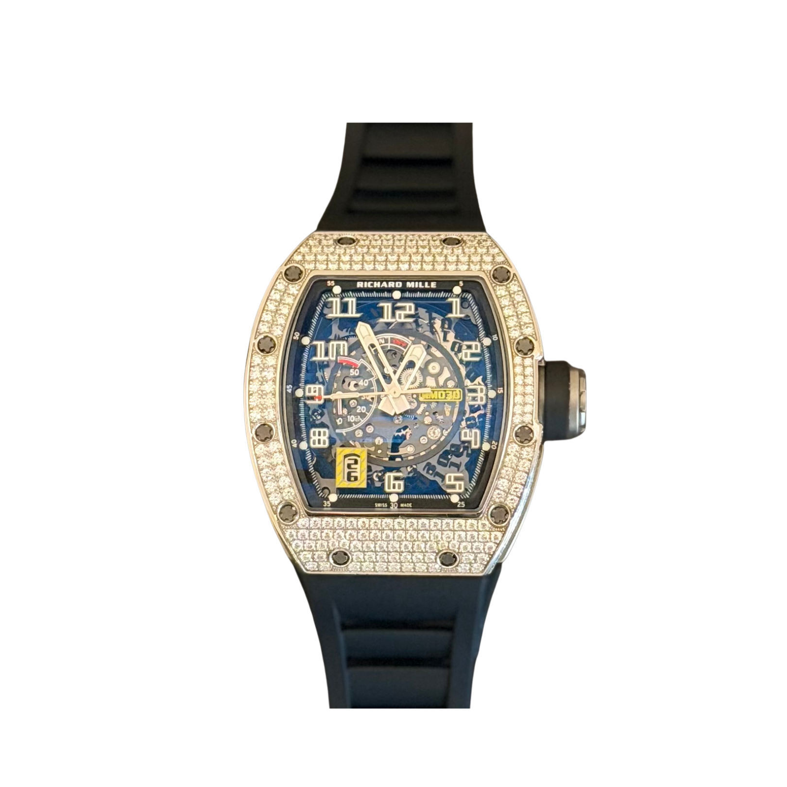 The Richard Mille RM 030 in white gold with diamond setting is a masterclass in technical ingenuity and refined aesthetics. At its core lies the declutchable rotor, a mechanical innovation that automatically disengages from winding the mainspring when the power reserve reaches 50 hours and re-engages below 40 hours, preserving the movement and enhancing reliability. An “ON/OFF” indicator on the dial displays the winding status at a glance.