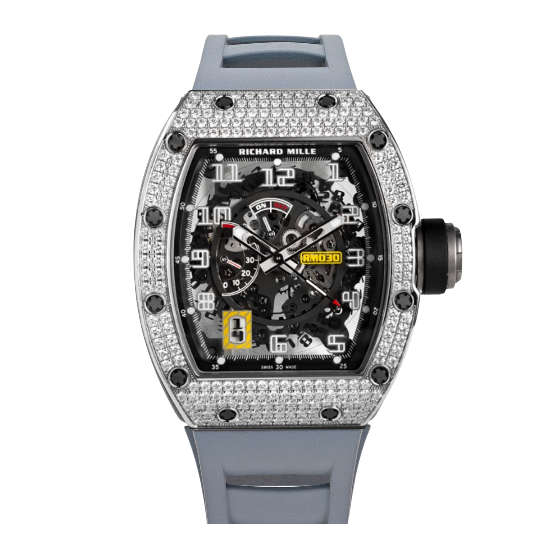 The Richard Mille RM 030 in white gold with diamond setting is a masterclass in technical ingenuity and refined aesthetics. At its core lies the declutchable rotor, a mechanical innovation that automatically disengages from winding the mainspring when the power reserve reaches 50 hours and re-engages below 40 hours, preserving the movement and enhancing reliability. An “ON/OFF” indicator on the dial displays the winding status at a glance.