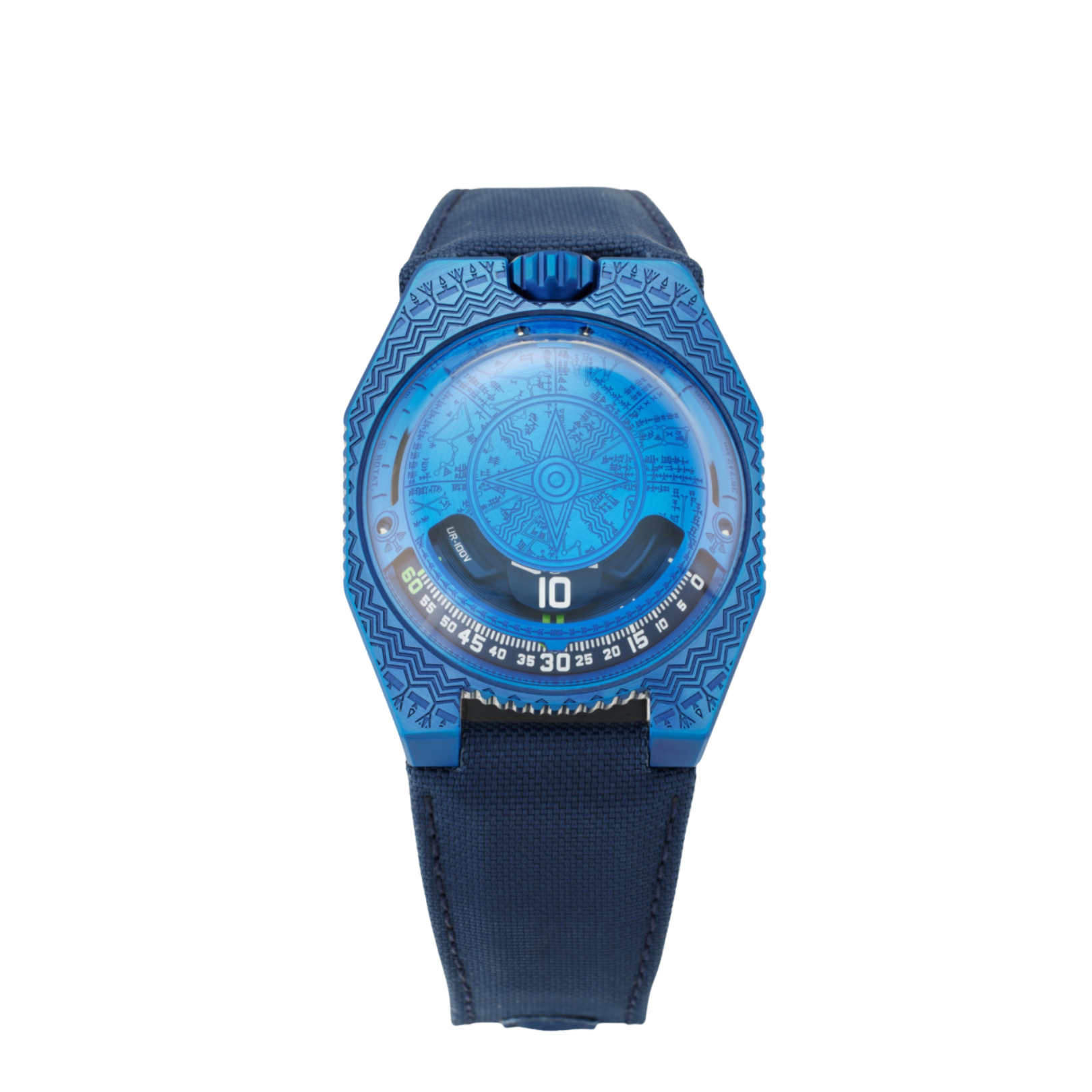 The URWERK UR-100V Time & Culture II “Sumer” exemplifies the brand’s fusion of futuristic design and horological ingenuity. Its 41mm x 49.7mm steel case, paired with a titanium caseback and a crown positioned at noon, creates a bold yet refined presence on the wrist, while the domed sapphire crystal reveals the intricate satellite hour and minute display, along with the unique rotational and orbital distance indicators every 20 minutes. Powered by the caliber UR 12.02, which combines a Vaucher base automatic movement with URWERK’s in-house module, the watch features the innovative Windfänger airscrew, 40 jewels, and a 28,800vph frequency for precision timekeeping, complemented by a 48-hour power reserve. With a water resistance of 30 meters and a black Baltimore woven fabric strap with pin buckle, the UR-100V balances avant-garde functionality with everyday wearability. Produced in an ultra-limited run of 30 pieces, the “Sumer” is a remarkable statement of URWERK’s technical mastery, forward-thinking design, and dedication to exclusive craftsmanship.